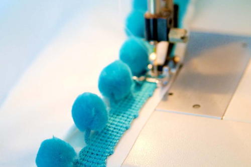 Sew the pom pom string to one long edge of two fabric panels. This will create a cute decorative 'doorway' for the nook.