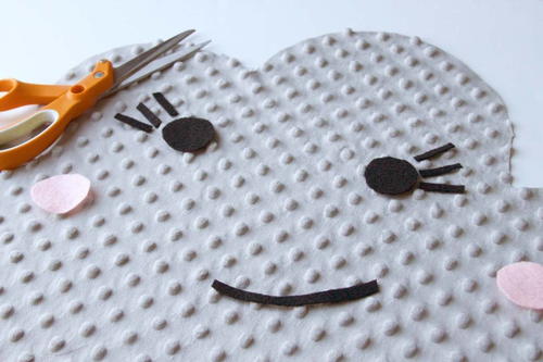 Cut facial features from colored felt and use a fusible interfacing to temporarily adhere the cut-outs to the front of one cloud fabric piece.