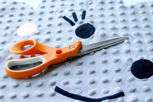 To create the cloud floor pillows, place two pieces of minky fabric on the work surface. Use a marker to draw an outline of a cloud and cut out through both layers using the shears.