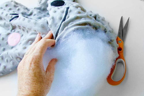 Trim the seam allowance on the pillows and cut curves. Turn the pillow to the right side and begin to stuff with poly-fill. Close the hole with several small hand stitches.