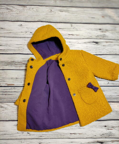 "This pattern is available for 1.5-6 year old children. It’s unisex, will fit both girls and boys. My coat is made from boucle and lined with French Terry, sleeve lining is jersey, you can, of course, use different fabrics. Try to stick with medium to heavyweight or go for a size smaller as it would be roomier. I recommend making a toile first. Now I don’t know whether it’s the coat or maybe just bad luck. But everything was just trying to drag me away from it or tools were going missing. It was as if this coat never wanted to be sewn!"