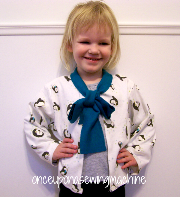 The Tie It Up Cardi is perfect for layering in the spring and fall. Made from knit, it has a simple neckline finish that extends into a tie. Also suitable for fleece. Available in size 3-4. Pattern is easily adjusted to fit a larger or smaller child.