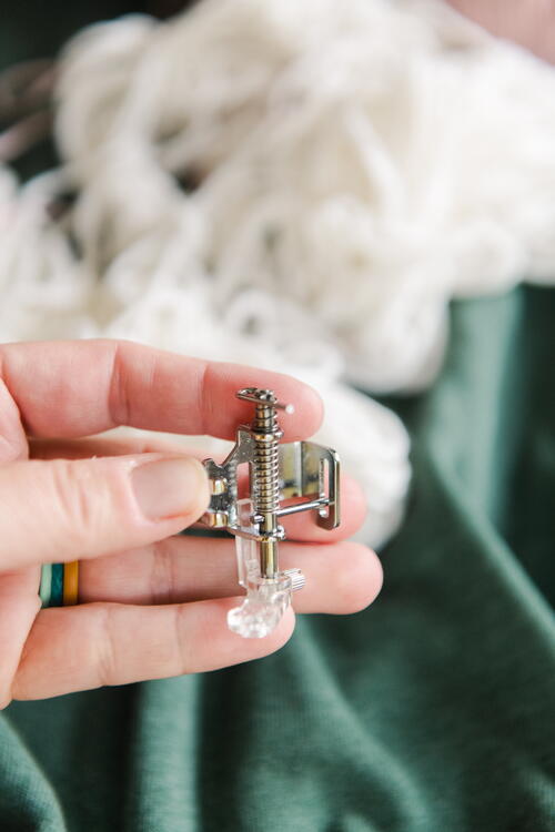 Prep your machine by removing the screw holding the regular foot and foot holder in place and attach the free motion couching foot - make sure that you have already attached the plastic #1 or #2 to the couching foot holder depending on the weight of your yarn.
