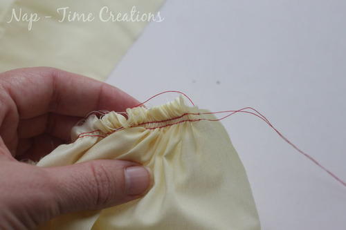 Pull the gathers until the fabric is the correct length. Tie your threads at both ends so the gathering will stay. Using this method is tricky because the single thread is more likely to break, so be careful when pulling the gathers.