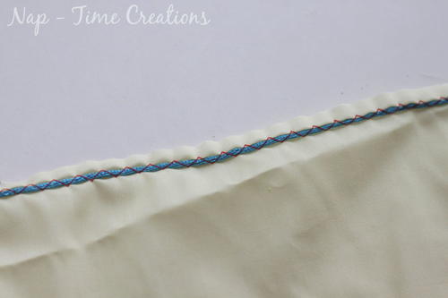 Place a cord or string about 1/3'' from the top of your fabric and sew the zig-zag over the top of the cord. Be careful to NOT sew into the actual cord. You will want this to be able to slip through the stitches and if the needle sticks it, it will be stuck.