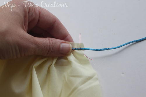 When you get to the end hold the stitches in one hand and pull the cord (blue here) with the other hand. This will cause the fabric under the first hand to gather.
