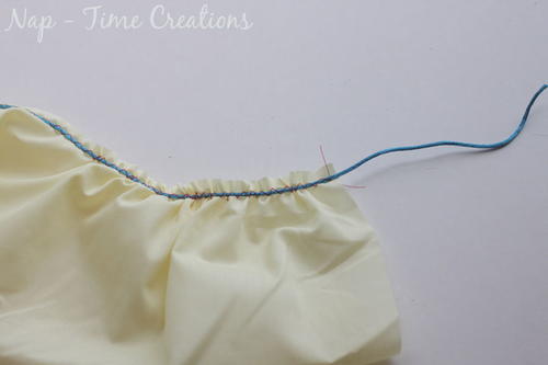 Continuing pulling until the fabric is the desired length. Smooth out the gathers and then use a basting stitch to hold the gathers in place. Remove the cord and continue with pattern.