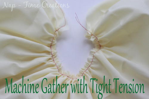 Adjust your sewing machine settings to Length 5 and Tension 8/9. More tension will make the fabric gather more tightly, and less tension will make the fabric gather less tightly.