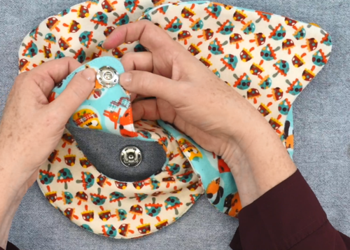 9. Sew snaps to attach the bib neck to the bib base. Strongly sew on a button to either side to accent the snap if desired (but make sure the button is secure because it could be dangerous if baby gets to it).