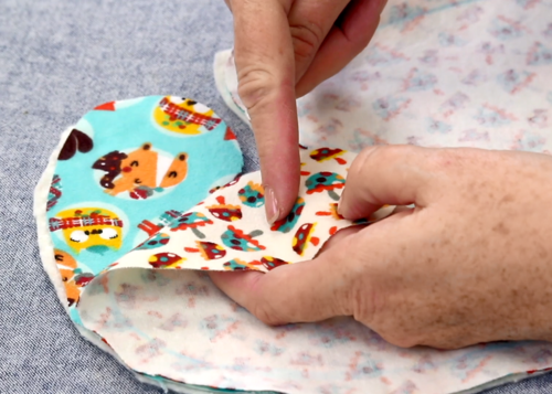 7. Turn out using the opening at the bottom you created. Carefully pull between the two fabrics outwardly until completely right side out and with the faces visible. Then turn up the opening and press.