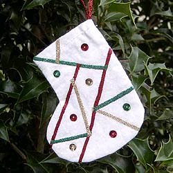 Use iron-on ribbon and embellishments to make this faux quilted stocking ornament, a free Christmas craft that looks like it's been arduously quilted--but it's faux!