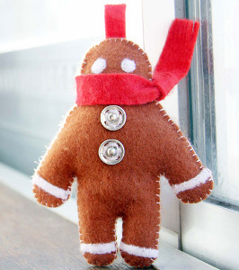 Very cute and simple Gingerbread Man ornament. I think I would use baby rick rack on his arms legs and make his eyes black or blue felt. You could buttons instead of snaps too. I also would make the scarf smaller and give him a smile and maybe a dot for a nose. Easy pattern that could spark your own creativity and very easy to modify.