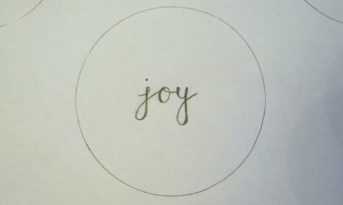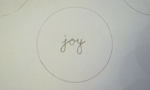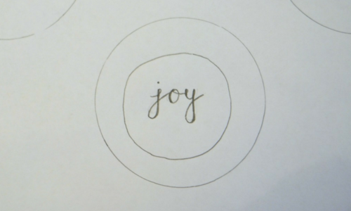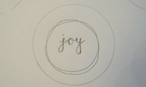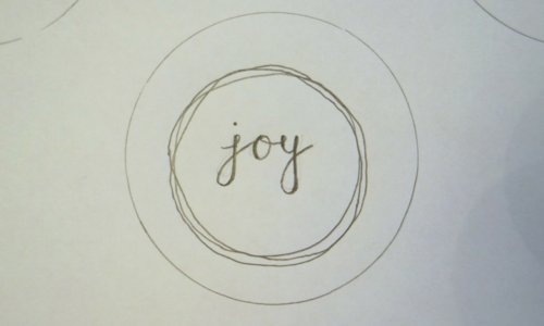 In a cursive style of handwriting, write the word "joy." On the downstrokes, add extra lines and color in the spaces.