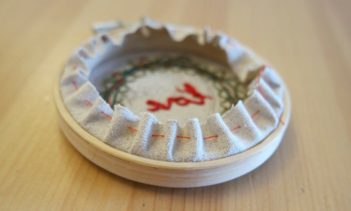 Put the embroidery into the hoop for display. Sew a running stitch around the excess fabric at the back and pull it tight.