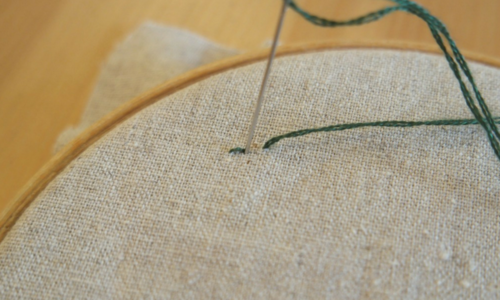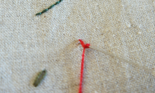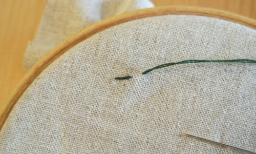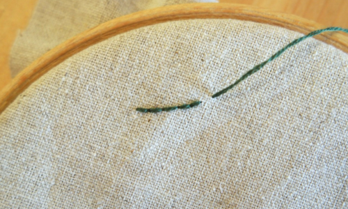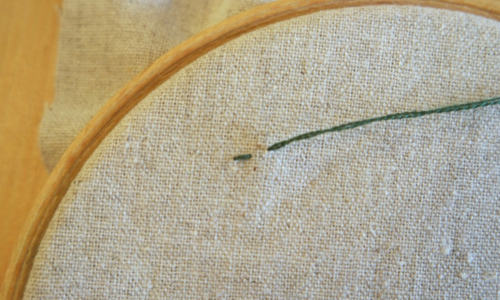 Now bring the needle back up on the right side, and make another stitch by sewing back to the end of the previous stitch.