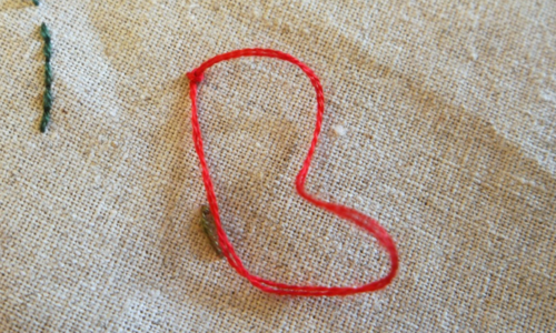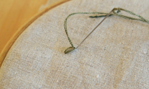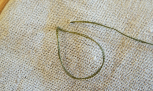 Bring the needle through to the right side of the fabric. Make a loop by passing the needle back through to the back, next to where the loop starts. This will be the bottom of the stitch.