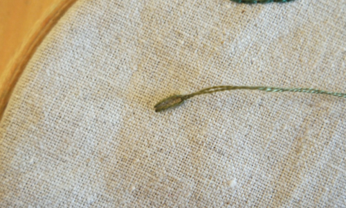 Bring the needle through to the right side. With the needle close to where the base of the knot will be, wrap the thread around the needle a couple of times.