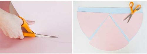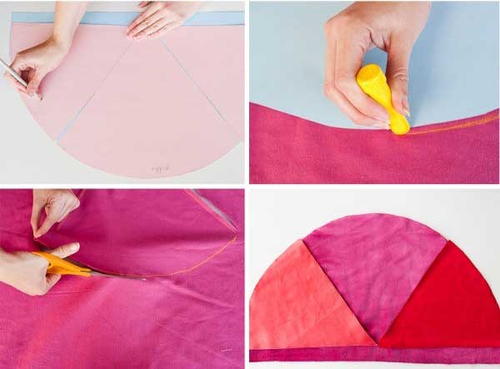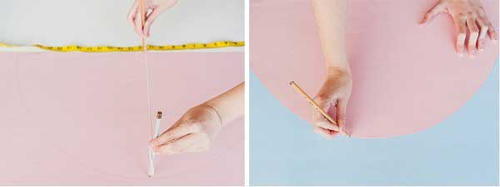 Create a template using a large piece of paper or poster board. If you want to create a half circle shape, like the one in this project, start by determining the base length (bottom of pillow) and then use two pencils and string (as shown in the photo) to create a half-circle shape that will be even on both sides.
