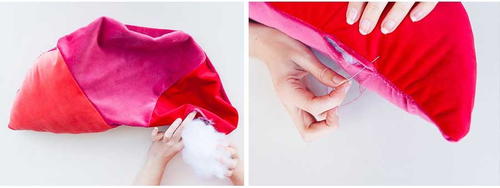 Turn the pillow inside out and iron on a low heat setting, using a towel to protect the velvet surface from direct heat. Add filling to stuff the pillow to your liking, using a wooden dowel to poke the corners with filling as necessary. Hand stitch the opening closed.