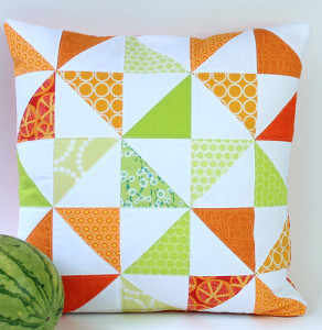 This Quilted Melon Slice Pillow is a bright, luscious piece of DIY home decor that will give your room a brand new look. Learn how to make a pillow with this easy, quick tutorial. This DIY pillow is made using die cutting, which is simple and saves time. The half triangle pattern is trendy and unique, sure to impress your guests. Use tropical colors to make your living room or bedroom feel like a Caribbean getaway. This eye-catching pillow will give your home a makeover without costing you a fortune.