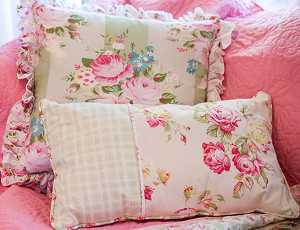 Inspired by crystal clear blue skies, sunshine and gardens in full bloom, Sunshine Roses is a happy, bright and unabashedly vibrant collection. Pretty roses, damask and stripes rendered in crisp clean aquas, pinks and greens will bring a bit of sunshine to your pillows. With this simple tutorial, you will learn how to sew a ruffled pillow and a lumbar pillow with this gorgeous, cheery fabric.