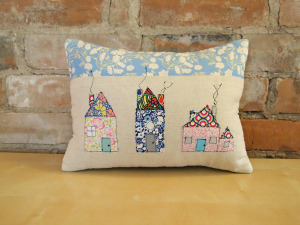 I have been wanting to try this black thread sketchy technique. Instructions for Welcome to the Neighbor Pillow are so easy to follow. Details are so on point - using blue fabric to resemble the sky, french knots for the door knobs, black squiggly stitching to resemble smoke from the fire place and adding a label on the back to place a message. Very nice indeed.