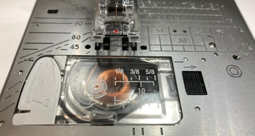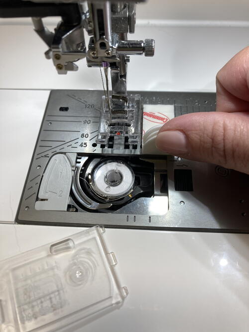 Note: It’s a good idea to place the non-adhesive tabs of your 3M Command strips over the bobbin case cover so that you can still access your bobbin if necessary.