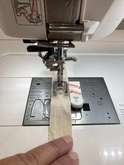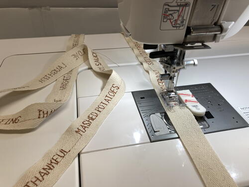 Once the words have been programmed into the sewing machine, you can start stitching the programmed words, feeding the tape and centering as you stitch along the cotton twill tape.