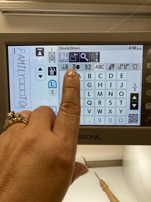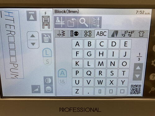 For this next step you will be using the lettering or monogramming feature of your sewing machine and the list of words your family members came up with. Depending on your sewing machine model, you’ll have either 5 MM, 7 MM or 9 MM lettering options. The following images show 9 MM lettering capabilities of the Janome Continental M7 Professional sewing machine.