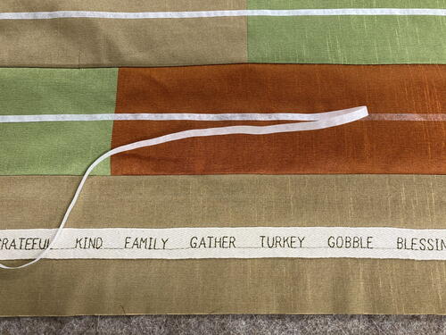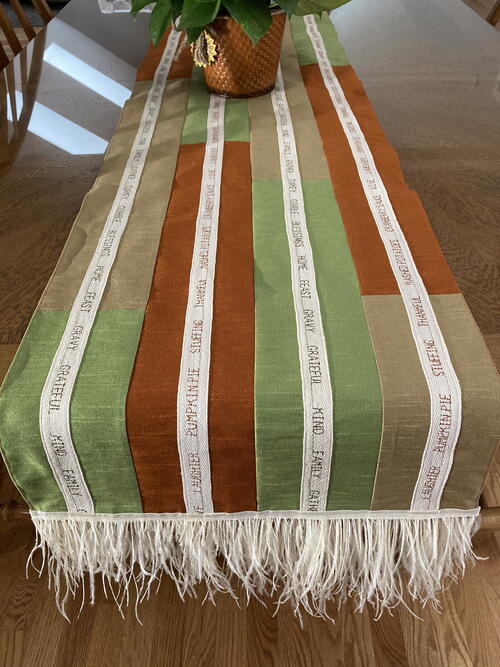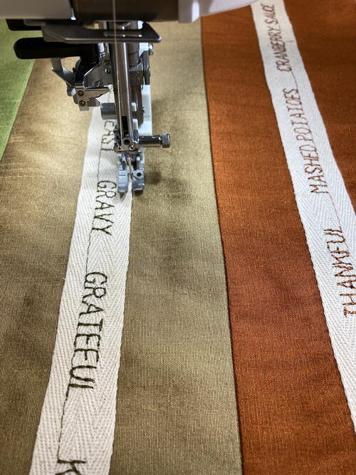 Here’s a few examples: gravy, happiness, naptime, grateful, turkey day, family time, parade, leftovers, football, thankful, pumpkin pie, wishbone etc. Once you have constructed the table runner, use those big 9 mm or smaller alphabet fonts found on your sewing machine with your satin stitch foot to sew out those special or fun words onto some cotton twill tape to add as a meaningful accent to your table runner. And don’t forget to experiment with various thread types such as variegated, metallic, rayon, cotton, polyester and try out different thread weights such as a heavier 30 weight thread to make those words really stand out."