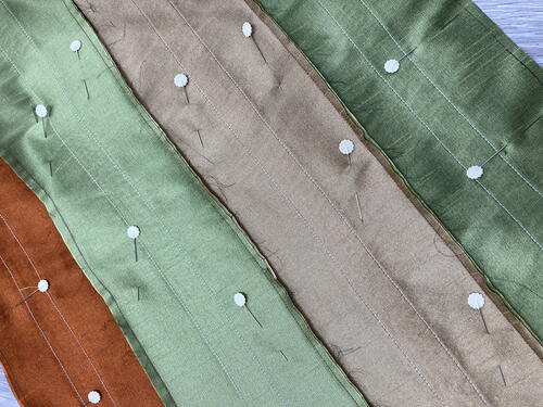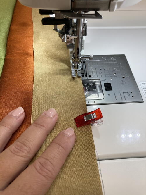 Next, use mini clips or pins to secure, then sew each of your 72.5” strips together lengthwise using a straight stitch and a ¼” seam allowance. Press the seams as you go along.