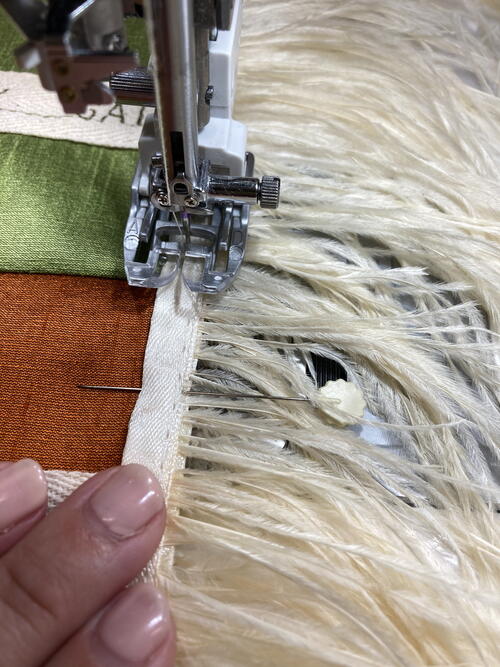 Measure the final width of your table runner, then cut 2 lengths of feather or other decorative trim double the width of the finished table runner and add ½” more to hide the raw edges. Pin the trim in place to each end. Fold the raw edges of the trim under ¼” and align overlapping the ends. Secure with pins. Because you are stitching through some bulk, use your walking foot and a straight stitch to attach the trim.