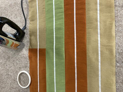 Next, using ¼” wide double stick tape, cut 4 pieces of tape about 1/8” short of the length of each fabric column. Peel away one side of the protective paper and stick the tape down along the center of your markings. Following manufacturer’s instructions, iron to adhere the tape along the entire length of each of the 4 fabric columns. Using double stick tape not only help keeps your twill tape aligned straight but it also secures the twill tape for stitching eliminating the need for pins.