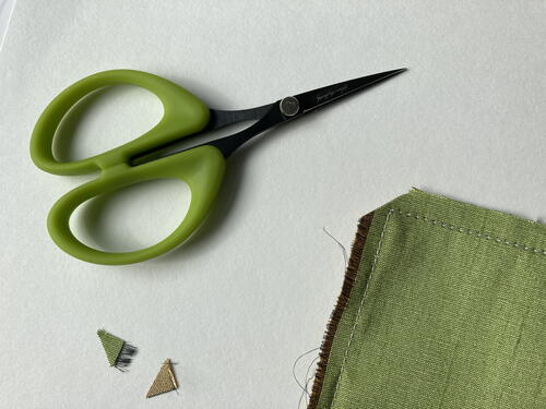 To reduce the bulk in the corners, carefully clip close to stitching all 4 corners. At the unstitched opening, turn the table runner right sides out.