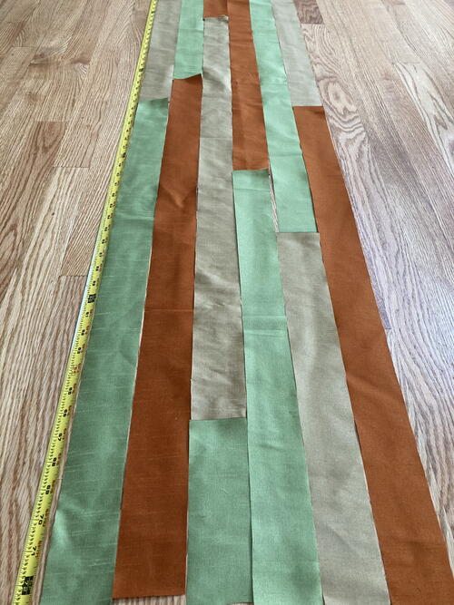 Next, cut each of the 6 fabric strips into 3 or 4 shorter lengths. Layout the shorter cut strips, staggering the cut strips by lengths and color until you are happy with your design. You should have 4 new columns of fabric strips that are 4.5” wide by approximately 75” long*.