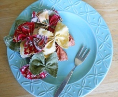Toy sewing patterns make great homemade gifts for kids to play with. Instead of buying pricey play food, why not use up fabric scraps with this fabric bow pasta?
