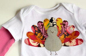 This is an adorable little shirt appliqu idea! And also a great way to use up some fabric remnants from your stash! I could also see embellishing this design with some ricrac or crossgrain ribbon trim to further outline the feather area. If the child is old enough you could use buttons for eye or further embellishment, if sewn on well, or even add some clear drying craft glue on the buttons as well as sewing them on. This would make a cute oattern in a onesie for a November born baby gift! Clever and cute!