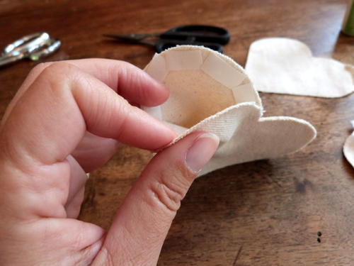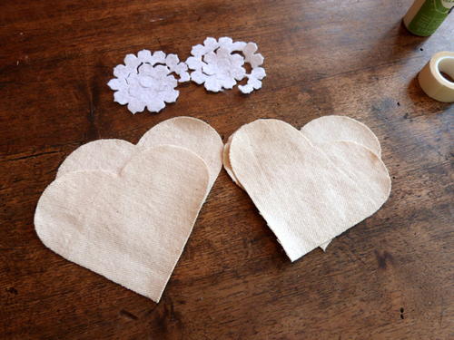 For each sachet, die cut two hearts from white denim and one rolled flower from fleece. If you don’t own die-cutting equipment, simply trace similar shapes from around your home onto fabrics or print patterns from the Internet.