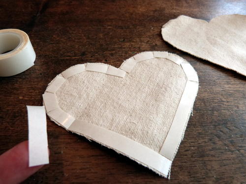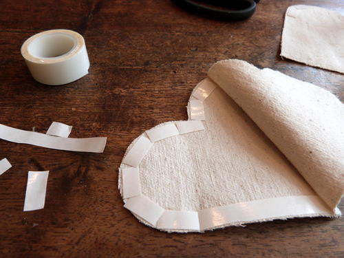 To join the hearts, cut several shorter strips of Fabric Fuse Tape to fit around edges of heart and press tape to wrong side of one fabric heart. Piece tape strips together, leaving no gaps.
