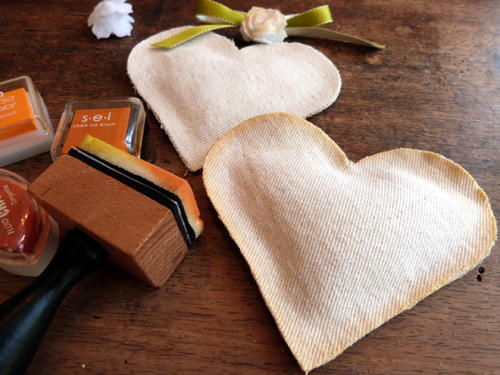 Using ink blending tool, ink heart edges light brown. Ink flower edges gold. Tie ribbon bow for each sachet. Using Fabric Fuse Liquid Adhesive, adhere bow and flower to top of each sachet. Let dry.