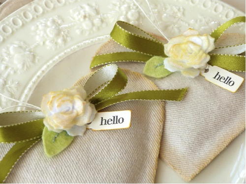 Stamp “hello” onto white cardstock using black ink. Die cut into small tag shape. Using ink blending tool, ink tag edges gold. Tie tag to ribbon bow using white string.