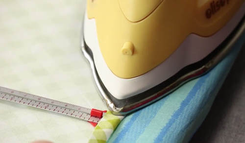 With a heated iron, press Fabric B using the following process: With the fabric wrong side up, turn one edge up 1/2-inch (lengthwise) and press. On the opposite side of the fabric, turn the other up 1-inch (lengthwise) and press.