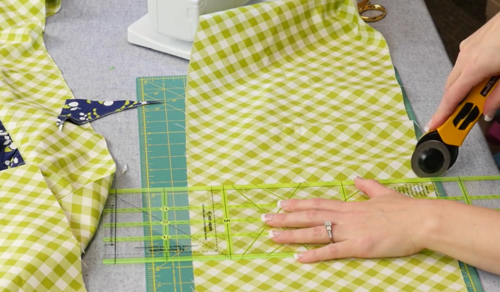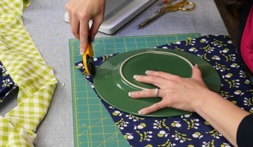 Using the plate as a guide, round the corner of the outside of Fabric A, folded in half. From Fabric B, cut two 9-inch by 40-inch strips.