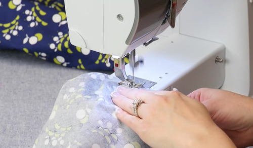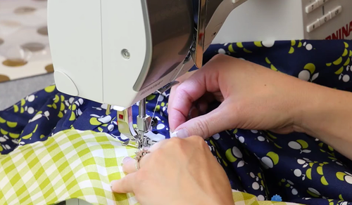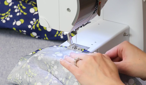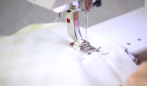 Like bias tape, use the pressed crease as the sewing guide. Sew across in the crease using a straight stitch and locking the stitch at the end.
