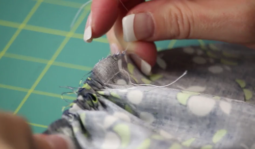 (Fabric A) To finish the top, gather using your machine first, then finishing by hand. Use a long basting stitch or preferred method. Finish the gathering by hand. It can be a light or medium ruffle, whichever you prefer.