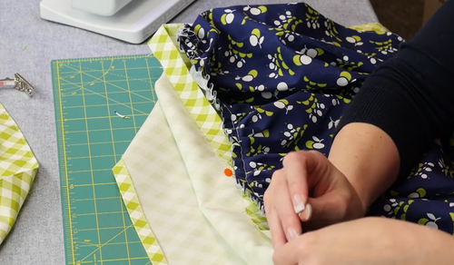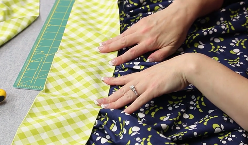 Fold the Fabric B sash in half crosswise and mark the halfway point with a pin. Fold the Fabric A skirt in half crosswise and mark the halfway point with a pin.